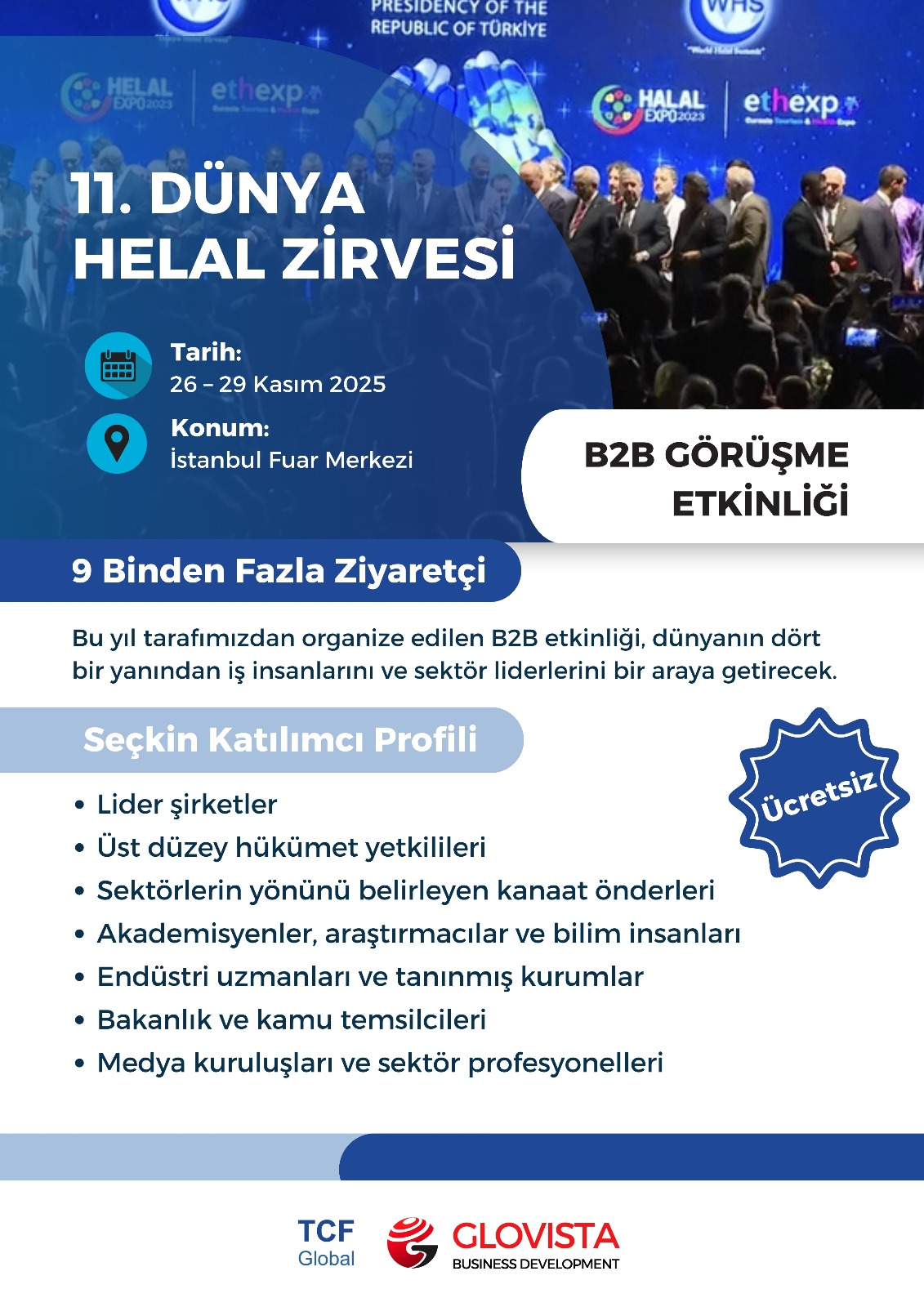 Detaylar: Finans, gıda, turizm ve kozmetik gibi birçok alanda dünyanın dört bir yanından gelen alım heyetlerini buluşturan Dünya Helal Zirvesi B2B Organizasyonuna katılım fırsatı.